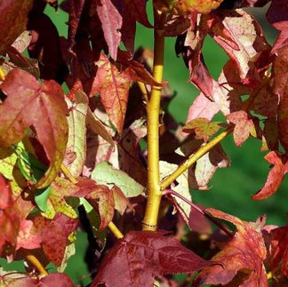 'Golden Sun': Petit arbre lumineux au feuillage doré virant au jaune ambré à l’automne. Croissance lente, idéal pour les petits espaces. Taille adulte : 3 à 4 m